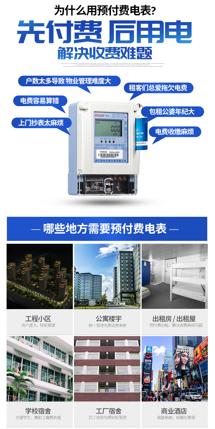 (4)預(yù)付費電度表適用的場所:工程小區(qū)用戶-龐大輕松管理,公寓樓宇-統(tǒng)一管理收費系統(tǒng),出租房或出租屋-預(yù)付費功能解決收費麻煩問題,學(xué)校宿舍-方便學(xué)生教職工收費充值,工廠宿舍-員工宿舍電費管理,商業(yè)酒店-搭建系統(tǒng)規(guī)模化管理等具體如下。